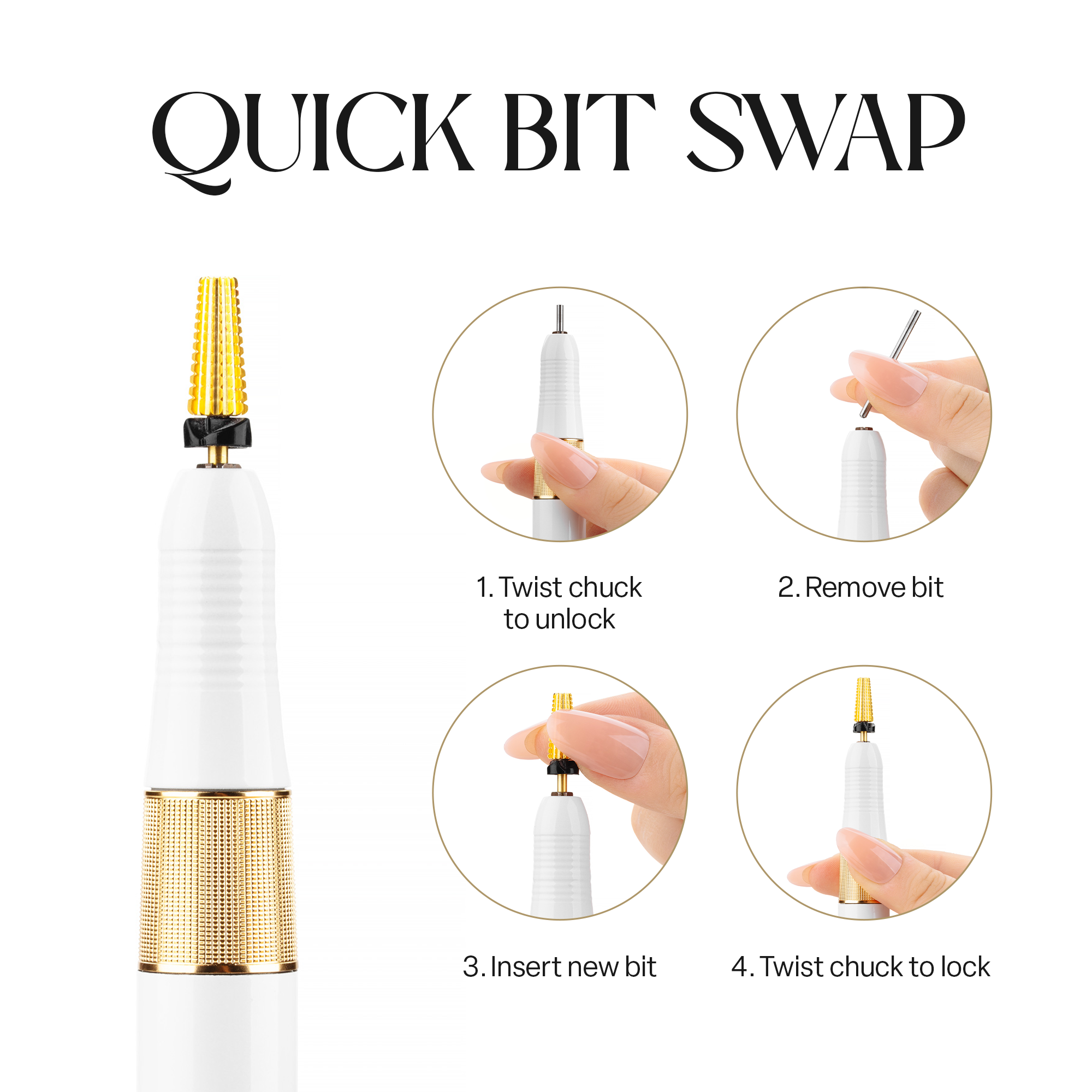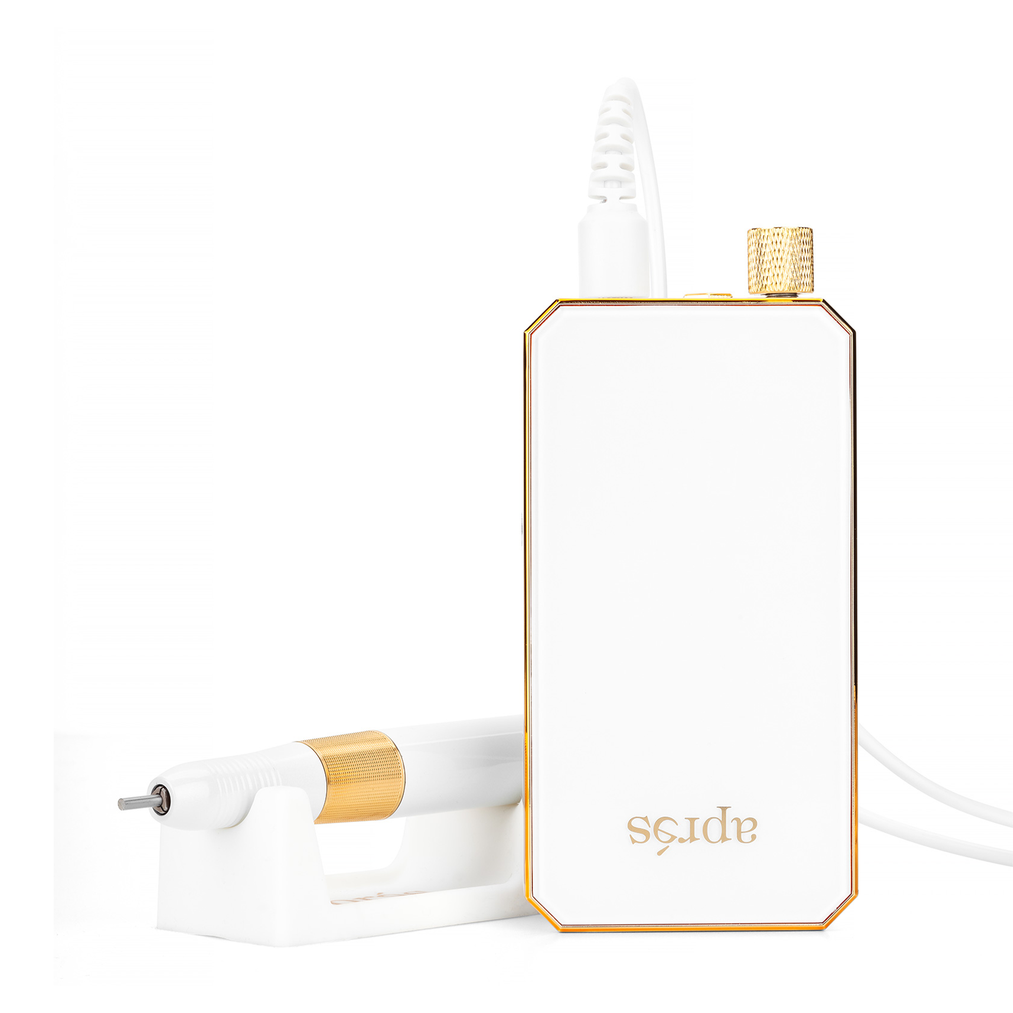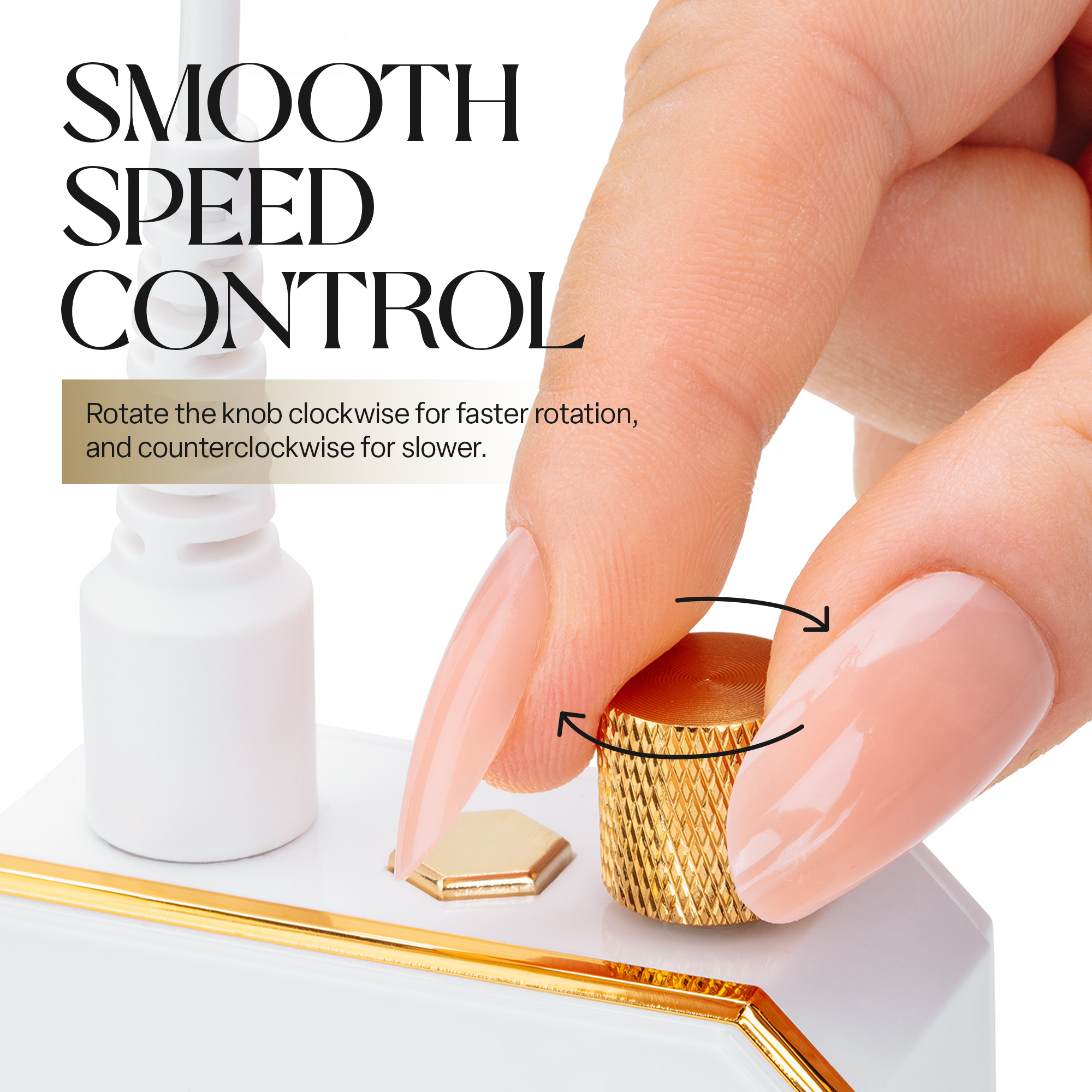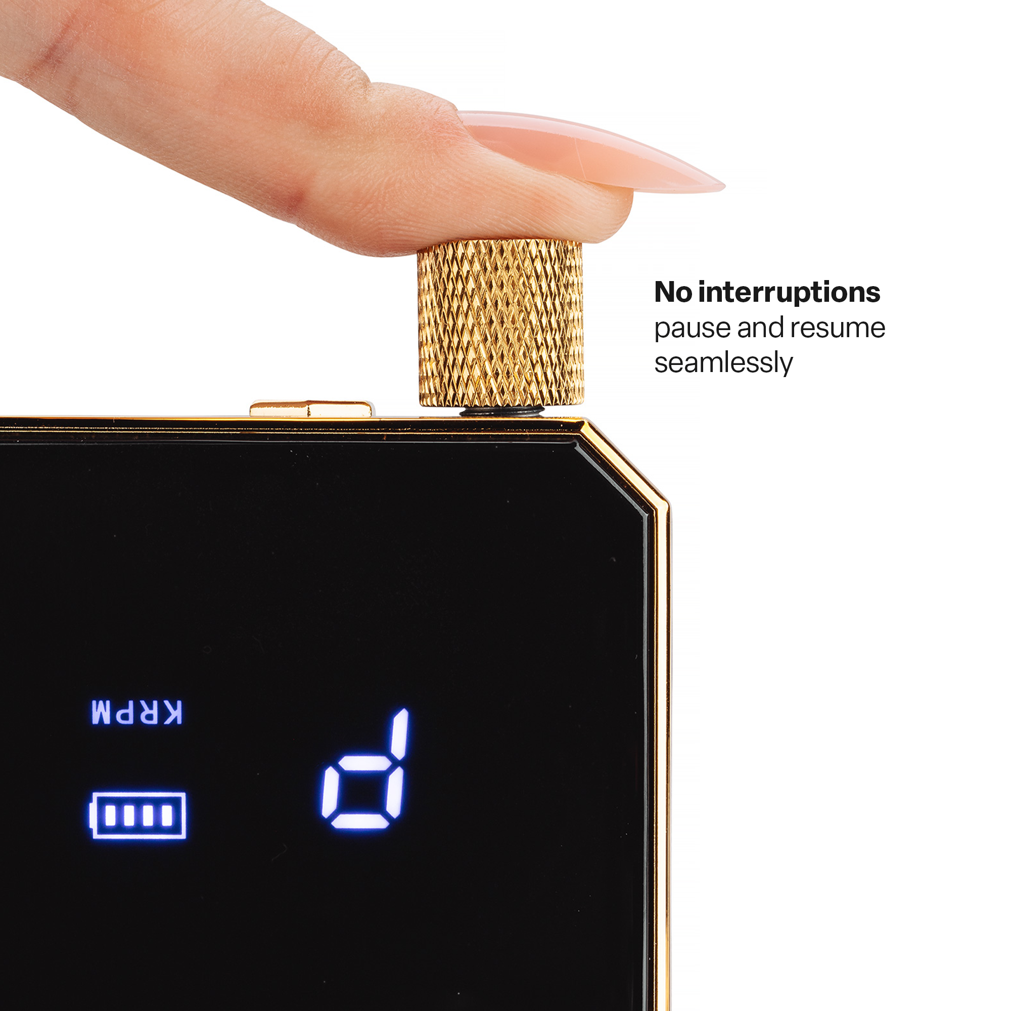 -Nachdem Sie das Handstück an die E-File-Maschine angeschlossen haben, schalten Sie den Drehknopf ein. Ein Klickgeräusch zeigt an, dass die E-File-Maschine eingeschaltet ist und die LED-Anzeige leuchtet.