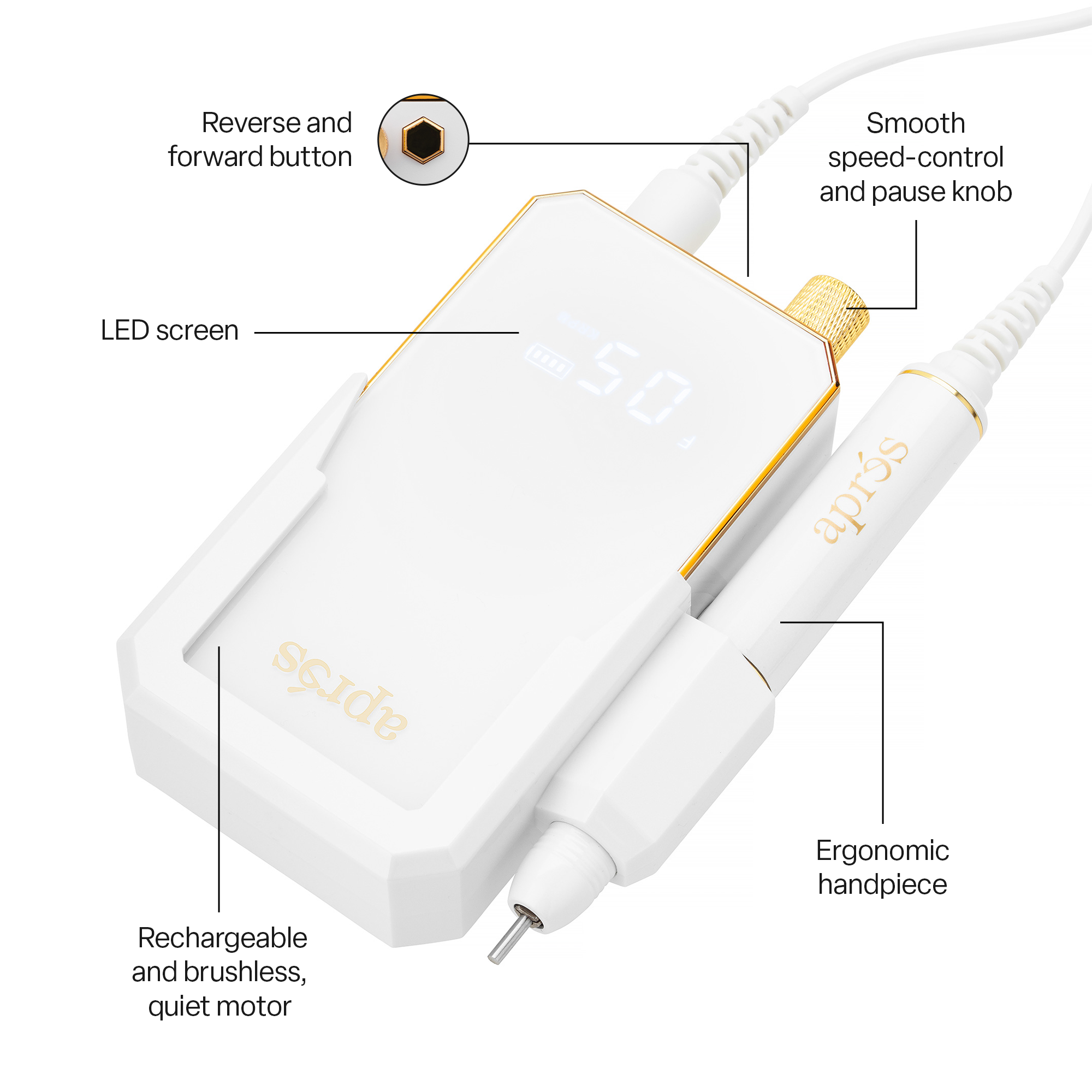 Nagelvorbereitung, -entfernung, -pflege und präzises Feilen mit höchstem Komfort und absoluter Kontrolle. E-File verfügt über einen langlebigen Akku und ein ausgewogenes Handstück mit leichtem Design, das die Ermüdung an langen Tagen im Salon reduziert! Ausgestattet für einen intelligenteren Arbeitsablauf und weniger Vibrationsrückkopplung ist E-File so konzipiert, dass es genauso hart arbeitet wie Sie, ohne Ihren Körper zu belasten.