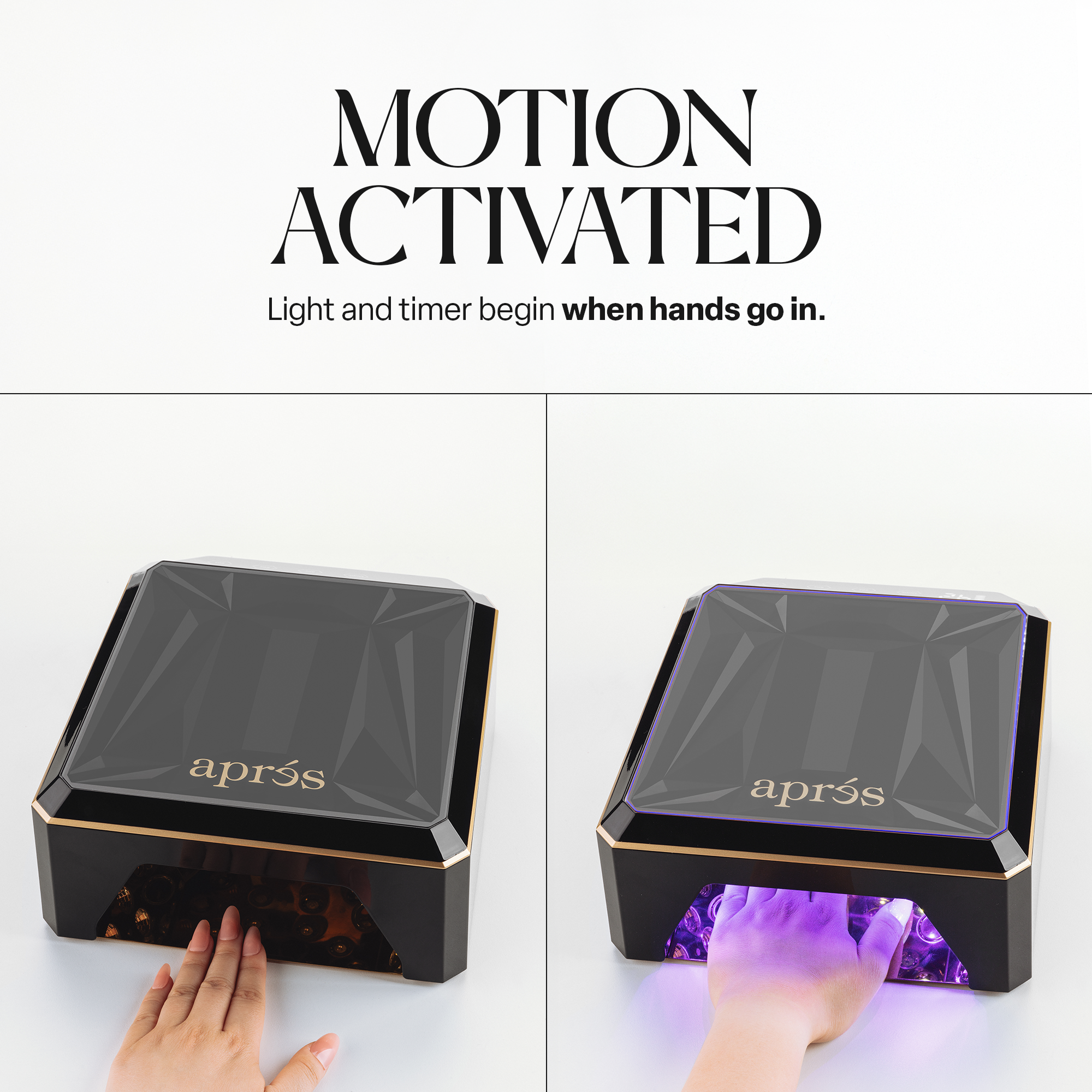 Um sicherzustellen, dass das Gel richtig aushärtet, legen Sie Ihre Hand in die LED-Lampe. Folgen Sie dabei den Anweisungen auf der Knopfnagelplatte. Die LED-Leuchten werden automatisch aktiviert, sobald Sie die Hand hineinlegen. Um die Aushärtungszeit zu verlängern, legen Sie Ihre Hand einfach erneut in die Lampe.