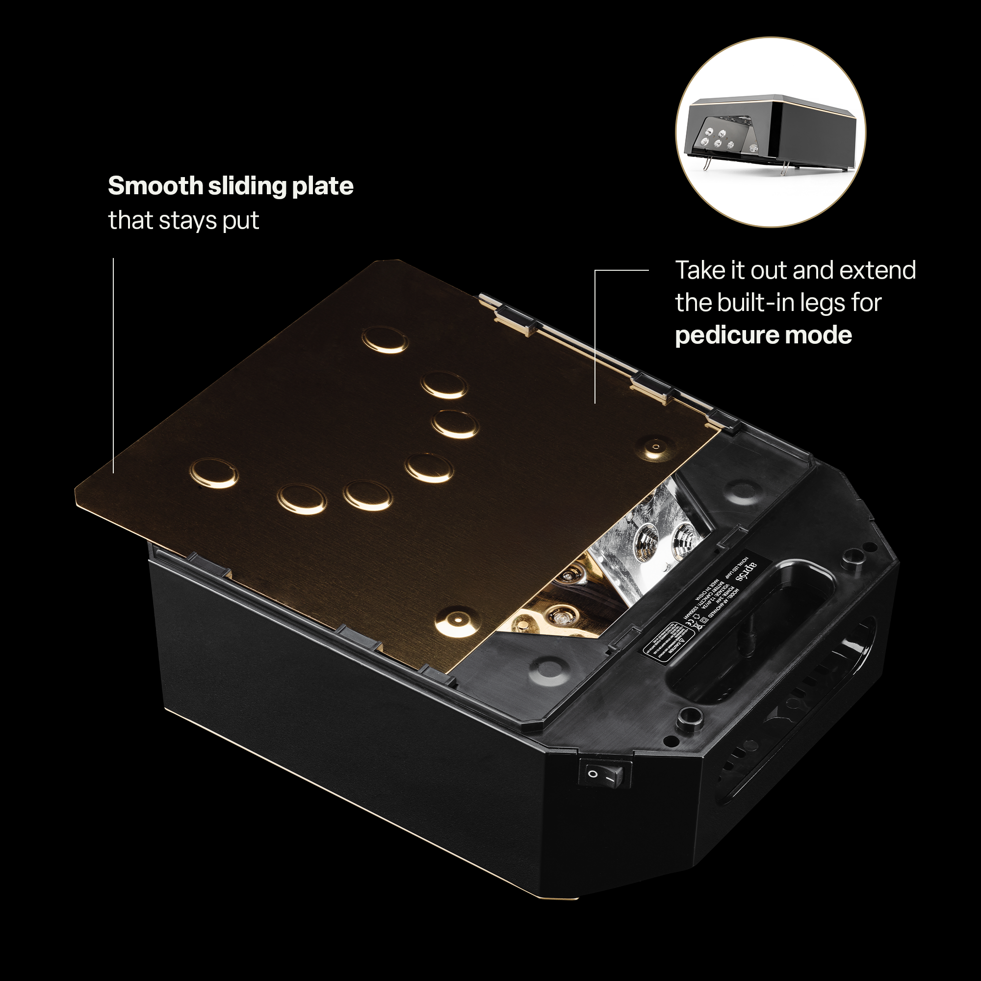 Um die Nova LED-Lampe im Pediküre-Modus zu verwenden, entfernen Sie die untere Nagelplatte und ziehen Sie die versteckten Füße an beiden Seiten heraus, um die Lampe anzuheben. Stellen Sie dann Ihren Fuß in die Lampe. Verwenden Sie die MODE- und Timer-Tasteneinstellungen wie für die Maniküre beschrieben.