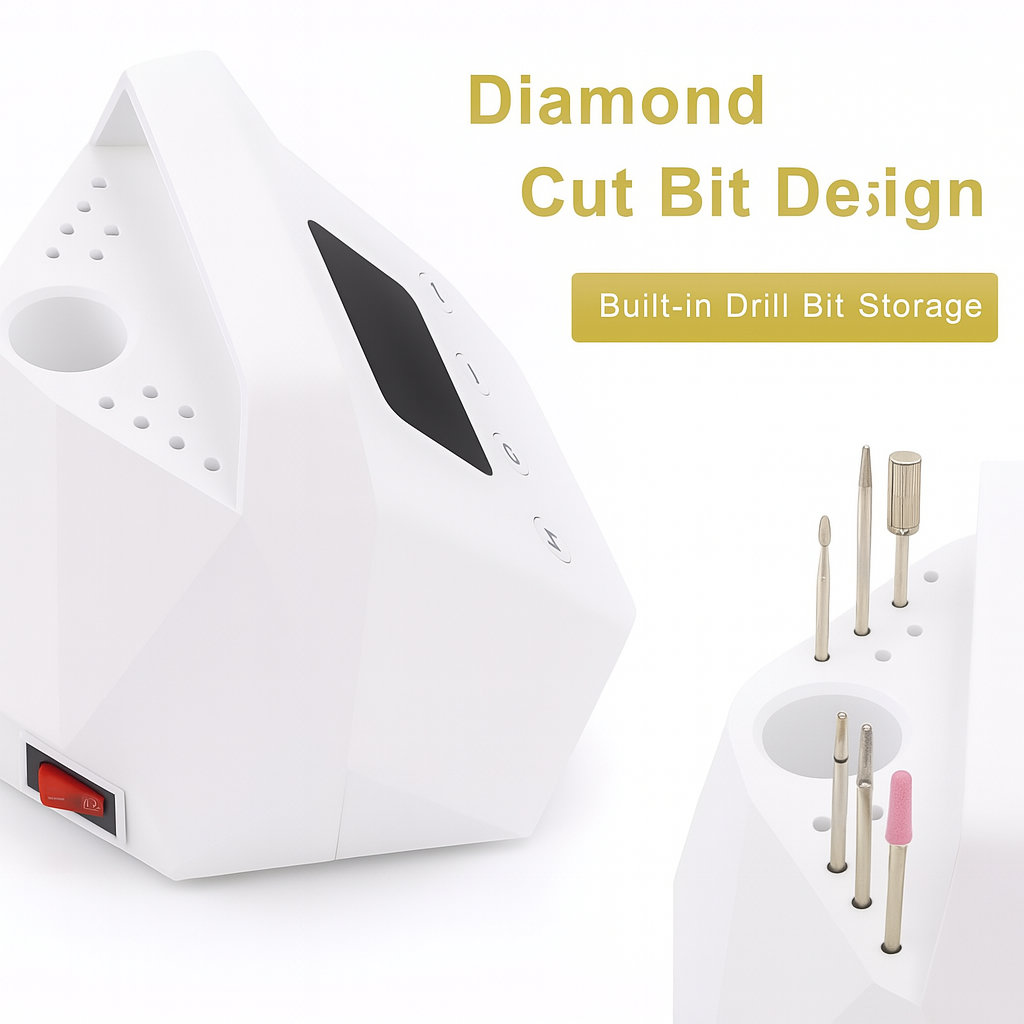 Professionelle 65-W-Fräsmaschine für Maniküre und Pediküre, mit stufenloser Drehzahlregulierung bis zu 35.000 Umdrehungen pro Minute. Mit Hilfe dieses Gerätes können Sie Ihre Nägel glätten und polieren, abgestorbene Hautschüppchen und Stylingrückstände entfernen.